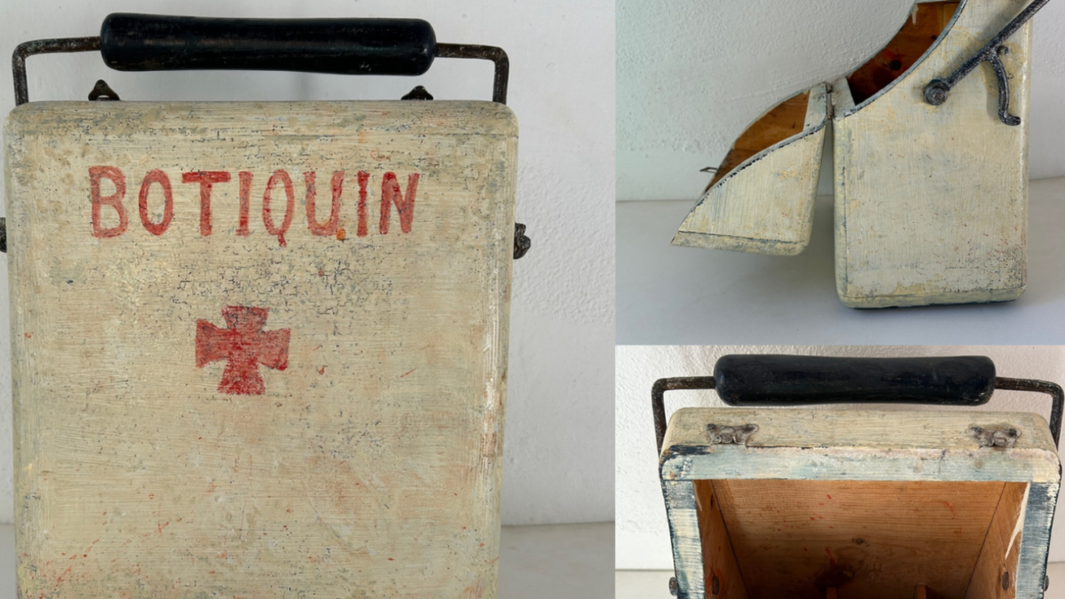 Aquesta farmaciola de cap al 1924 és una peça històrica molt funcional. Es tracta d’una caixa rectangular feta de fusta reforçada amb peces de metall, especialment a la part superior i a la tanca, que proporcionen durabilitat i resistència. La superfície està pintada de blanc, reflectint la necessitat d’una aparença neta i identificable, amb una creu vermella al centre de la tapa frontal i la inscripció “BOTIQUIN”, també en vermell , que la fa perfectament recognoscible com a kit de primers auxilis fins i tot a certa distància. La pintura blanca amb la creu vermella també feia que aquesta farmaciola fos visible en condicions de baixa lluminositat o de molta activitat, com en situacions d’emergència o rescat, contribuint a la seva ràpida localització en moments crítics.